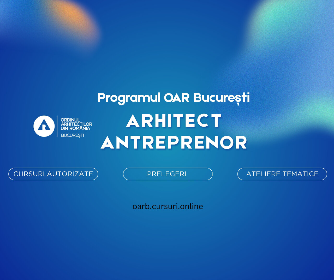 Programul Arhitect Antreprenor inițiat de OAR București este primul program de acțiuni și evenimente pentru dezvoltare antreprenorială și de business la nivel național în cadrul OAR. El reunește o serie amplă de cursuri, prelegeri, ateliere, podcasturi axate pe tema înțelegerii și dezvoltării spiritului antreprenorial pentru profesioniștii arhitecți.