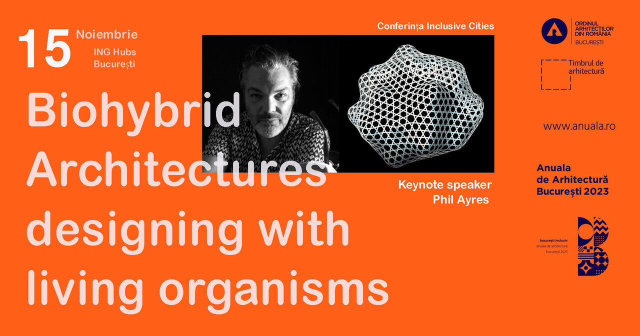 Sunteți invitați și așteptați să participați la eveniment alături de Phil care este profesor la Academia Regală Daneză unde predă în cadrul Institutului pentru Arhitectură și Tehnologie - Centrul pentru Tehnologia Informației și Arhitectură. El studiază proiectarea și producția de noi sisteme arhitecturale biohibride care urmăresc să cupleze simbiotic complexele tehnice și de locuit, împreună cu dezvoltarea unor medii de design complementare. Cercetarea profesorului danez a fost realizată în contextul proiectelor UE flora robotică, Fungal Architectures și a proiectului EIC Pathfinder. Domeniile de cercetare în care este implicat Phil Ayres sunt: design arhitectural digital, fabricare digitală, simulare digitală, robotică, robotică neconvențională, sisteme biohibride.