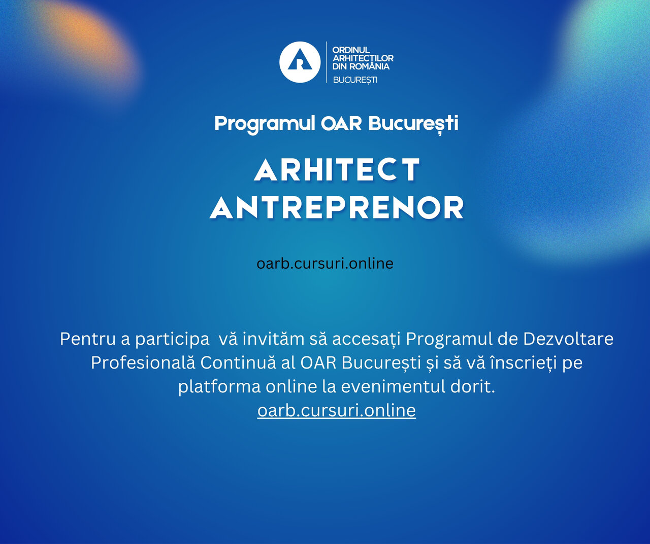 Programul Arhitect Antreprenor inițiat de OAR București este primul program de acțiuni și evenimente pentru dezvoltare antreprenorială și de business la nivel național în cadrul OAR. El reunește o serie amplă de cursuri, prelegeri, ateliere, podcasturi axate pe tema înțelegerii și dezvoltării spiritului antreprenorial pentru profesioniștii arhitecți.