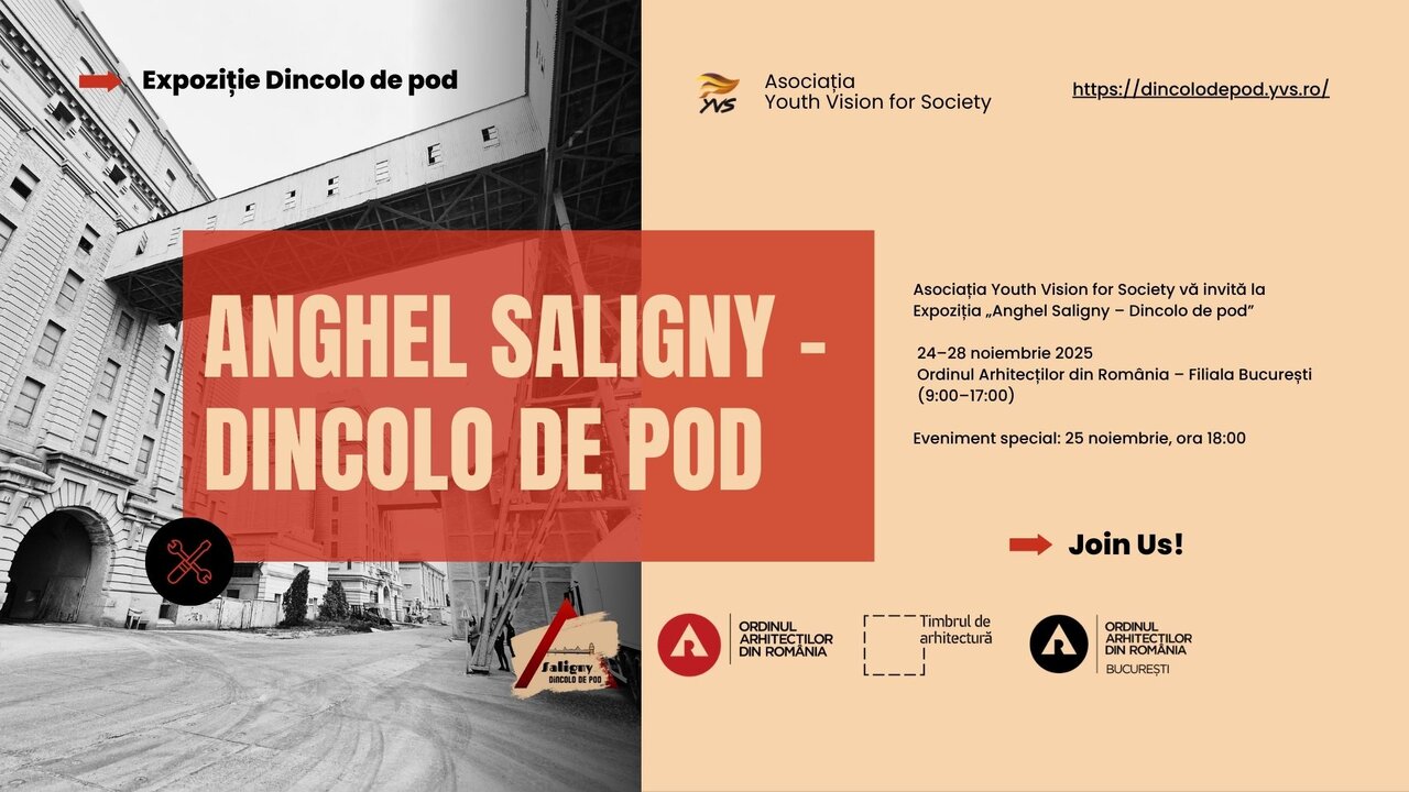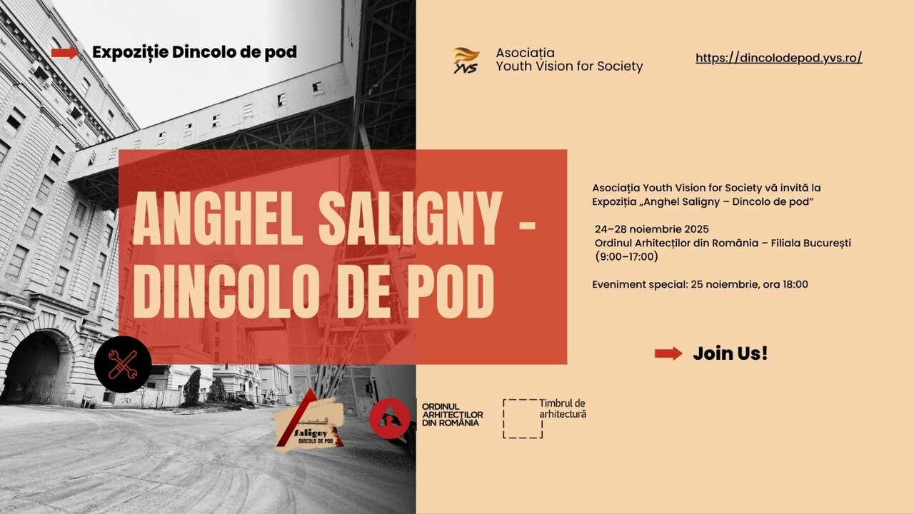 Asociația Youth Vision for Society vă invită la vernisajul expoziției “Anghel Saligny – dincolo de pod”, care are loc marți, 25 noiembrie, ora 18:00, în spațiul mansardei sediului Filialei București a OAR, str. Sf. Constantin nr. 32.