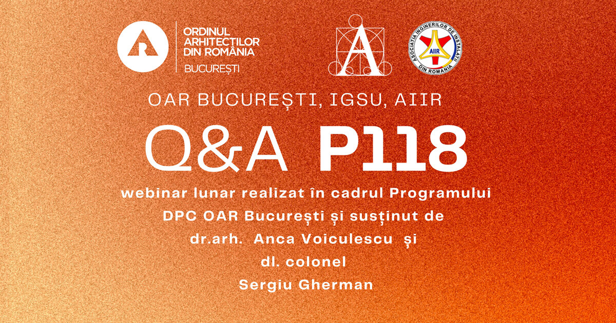 OAR București organizează împreună cu IGSU(Inspectoratul General pentru Situații de Urgență) Universitatea de Arhitectură și Urbanism „Ion Mincu” București (UAUIM) și AIIR(Asociația Inginerilor de Instalații din România) webinarul Q&A P118. Seminarul online se desfășoară pe platforma Zoom și va parcurge, respectiv explica prevederile normativului P118 care este în vigoare.