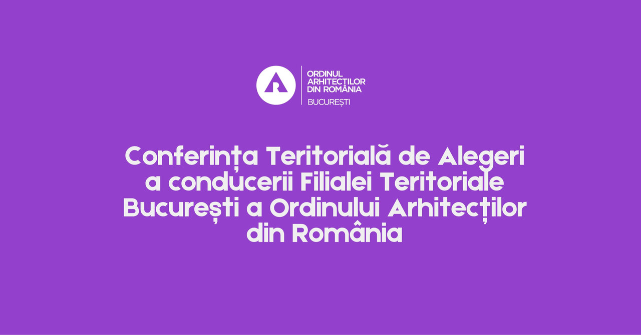 Filiala Teritorială București a Ordinului Arhitecților din România organizează pe data de 16 mai 2026 Conferința Teritorială Ordinară de alegeri, în cadrul căreia vor fi alese forurile de conducere și comisiile filialei pentru perioada 2026 – 2030 și vor fi aprobate atât Lista membrilor filialei candidați la Consiliul Național cât și Listele delegaților și supleanților filialei la Conferința Națională Ordinară de alegeri a OAR, din 20 - 21 iunie 2026. În cadrul conferinței vor fi prezentate rapoartele de activitate ale actualei conduceri și se va face descărcarea de gestiune a conducerii din perioada 2022 – 2026.