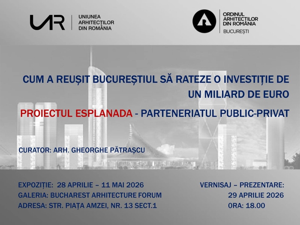 OAR București anunță că în perioada 29 aprilie 11 mai găzduiește în spațiul BAF - Piața Amzei 13, expoziția „CUM A REUȘIT BUCUREȘTIUL SĂ RATEZE O INVESTIȚIE DE UN MILIARD DE EURO — PROIECTUL ESPLANADA — PARTENERIATUL PUBLIC-PRIVAT”, un demers documentar